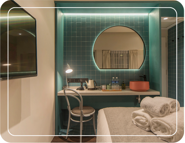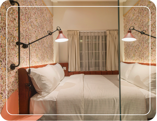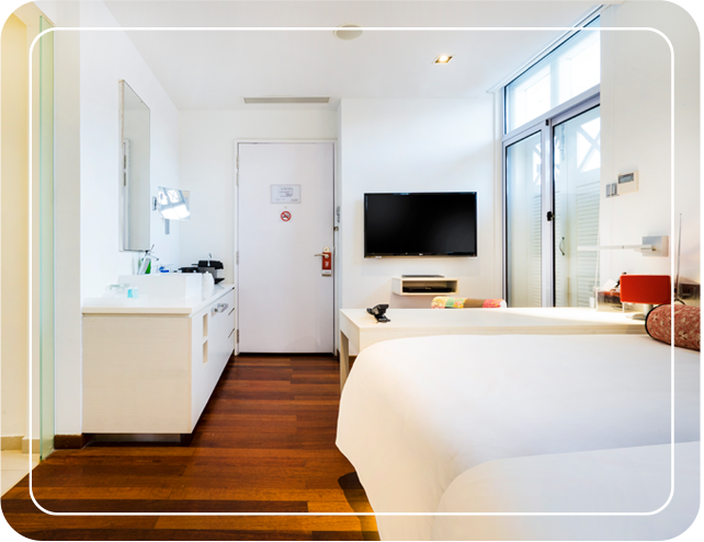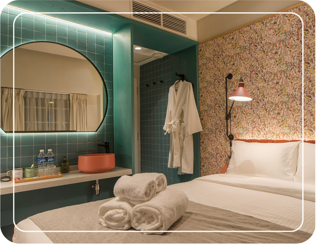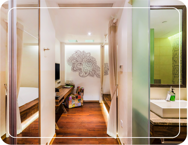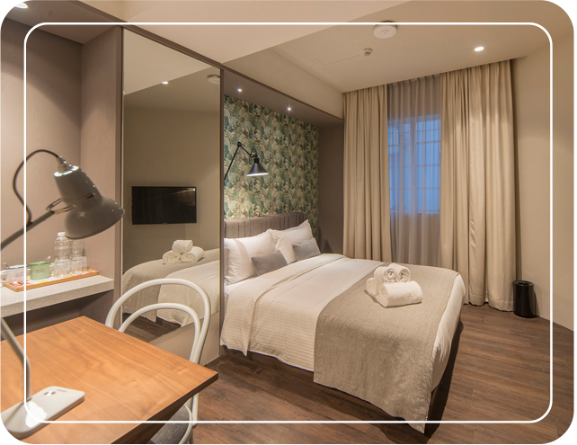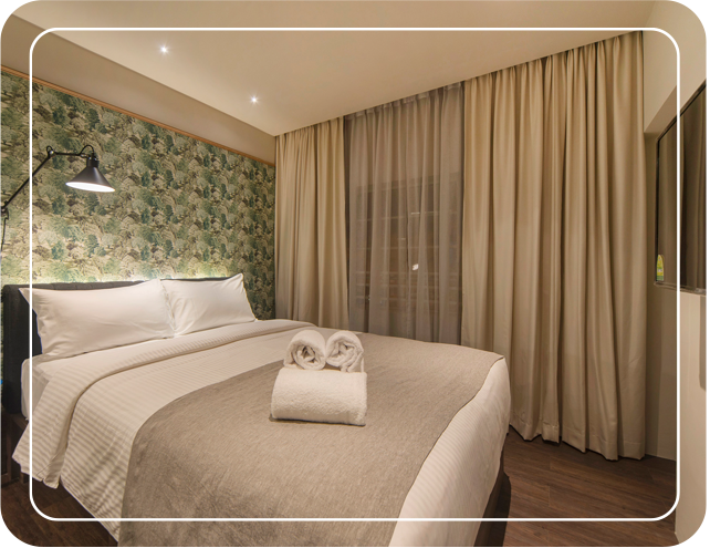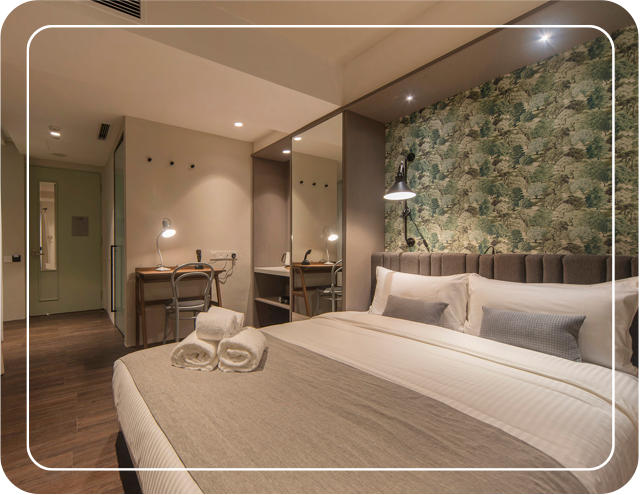 A spacious room with forest line prints that allow guests to rest and relax after a hectic day.