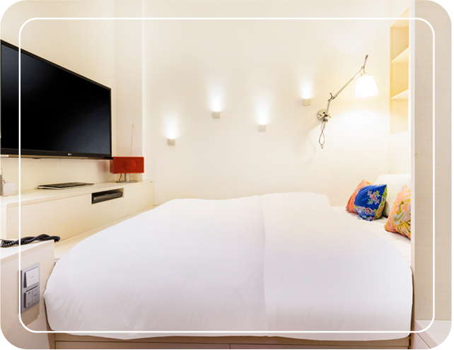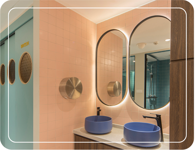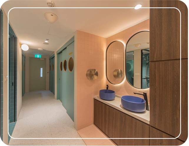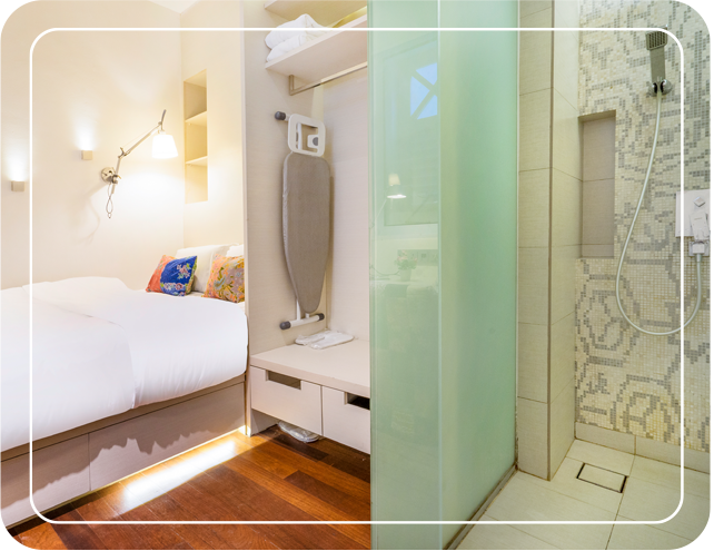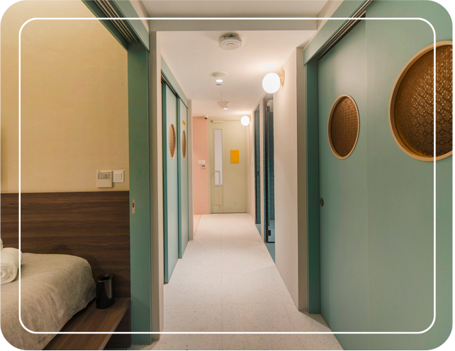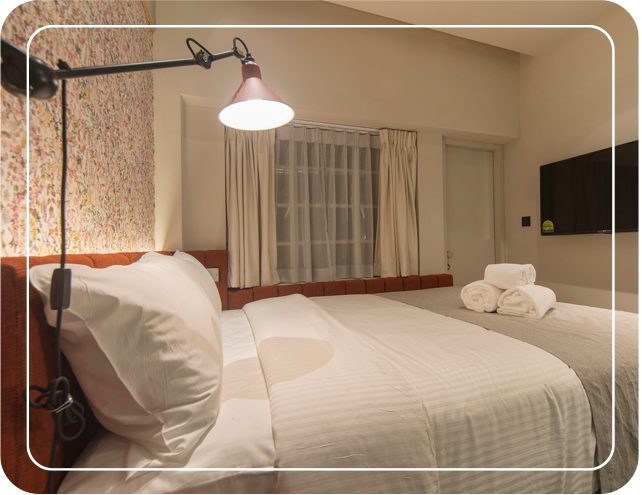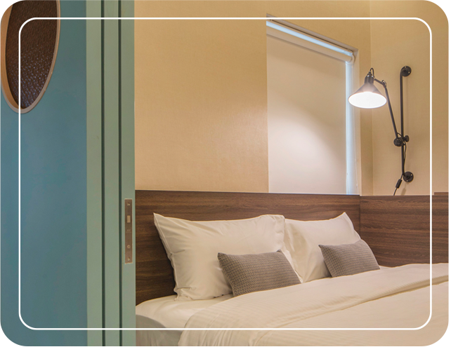 A mixed co-living space with a king-sized bed and common bathroom. Sliding doors are available for partitions to form individual private rooms.
